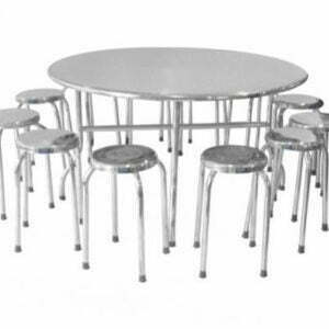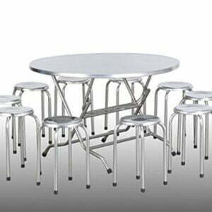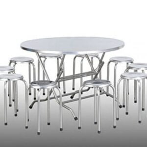 Bộ bàn ghế inox tròn giá rẻ là dòng sản phẩm gồm 1 bàn và 10 ghế tròn được sản xuất bằng vật liệu inox loại tốt. Mặt bàn với đường kính khá lớn 1,2m có thể phục vụ được 6 – 10 người cùng một lúc. Bên cạnh đó, chiều cao mặt bàn (0,75m) rất tương thích với mặt ghế (0,5m) và cũng thích hợp với hầu hết các loại ghế được sử dụng phổ biến hiện nay. Ngoài ra, mặt bàn còn có khả năng gấp gọn cùng với những chiếc ghế có thể xếp chồng lên nhau sẽ giúp tiết kiệm được rất nhiều không gian cất chứa. Với bộ khung chịu lực là 4 chân làm bằng inox có đường kính 32mm, dày 0,8mm, mặt bàn có thể chịu được vật với trọng lượng 180 kilogram (kg) đè lên. Trong khi đó, chiếc ghế với cấu tạo từ 4 thanh inox đường kính 25mm, dày 0,8mm cho phép sản phẩm có thể chịu được trọng lượng người ngồi lên tới 140kg.